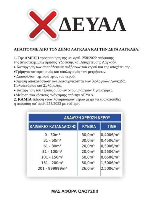 Σήμερα, 21 Μαρτίου 2023, συγκεντρωθήκαμε οι κάτοικοι του Πολυδενδρίου και των Πέντε Βρυσών μπροστά στο Δημαρχείο του Λαγκαδά, για να διαδηλώσουμε και να εκφράσουμε την δικαιολογημένη αγανάκτηση μας σχετικά με τις καταχρηστικές και υπέρογκες αυξήσεις των τιμολογίων της ύδρευσης από την ΔΕΥΑΛ.