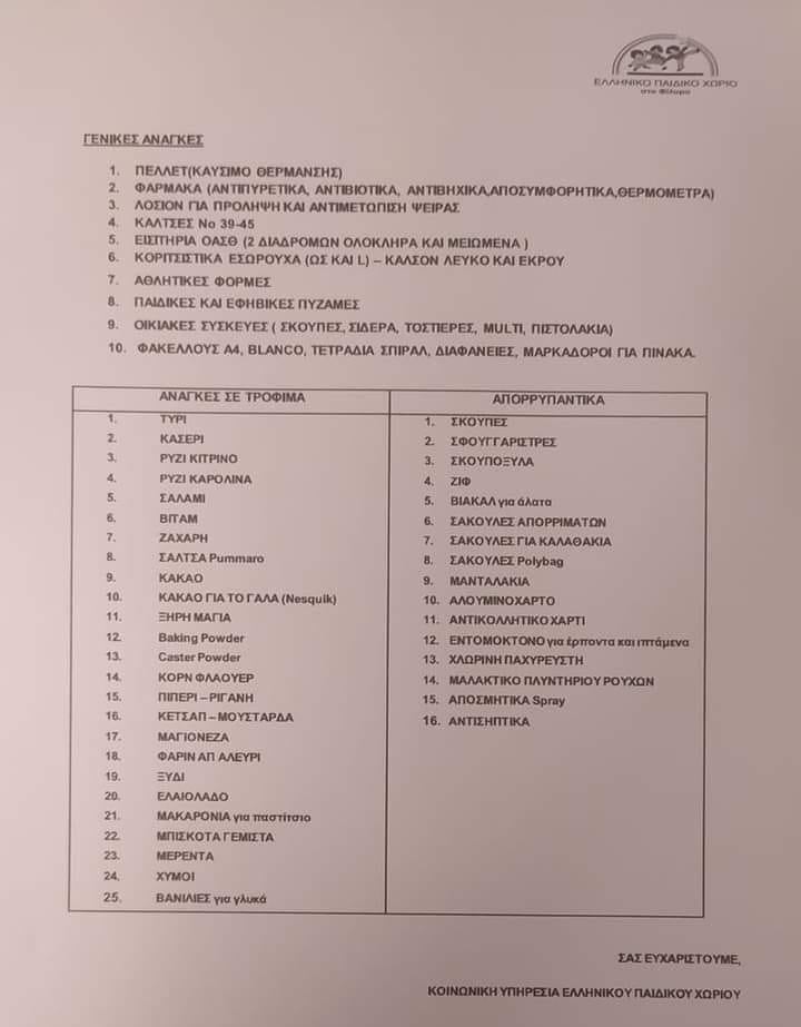 Όσοι επιθυμούν να υποστηρίξουν τη δράση του Δήμου Λαγκαδά, το Παιδικό Χωριό ανάρτησε ενδεικτική λίστα αναγκών με τα οποία μπορούμε να το στηρίξουμε.