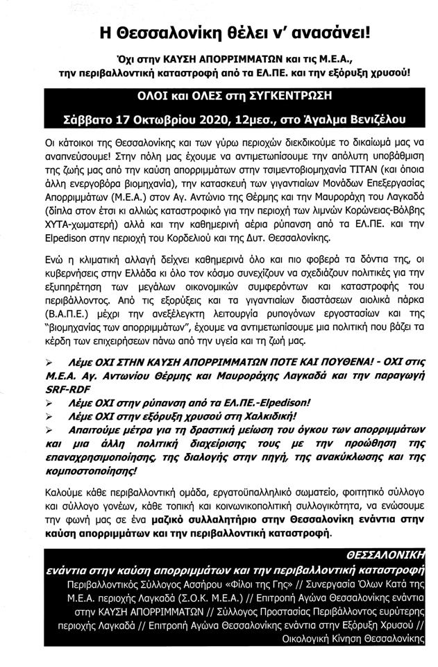 Σε διαδήλωση ενάντια στην καύση απορριμμάτων Σάββατο 17/10/2020 στις 12:00 Άγαλμα Βενιζέλου προσκαλούν ο Περιβαλλοντικός Σύλλογος Ασσήρου "Φίλοι της Γης", η Συνεργασία όλων κατά της ΜΕΑ Λαγκαδά, ο Σύλλογος προστασίας Περιβάλλοντος ευρύτερης περιοχής Λαγκαδά και άλλοι σύλλογοι