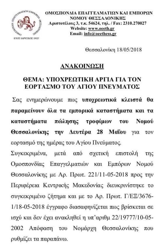 Κλειστά θα παραμείνουν τα Εμπορικά Καταστήματα και τα Καταστήματα Πώλησης Τροφίμων του Ν. Θεσσαλονίκης και κατ' επέκταση και στο Δήμο Λαγκαδά την Δευτέρα 28 Μαΐου για τον εορτασμό του Αγίου Πνεύματος.Διαβάστε λεπτομέρειες στην σχετική ανακοίνωση.