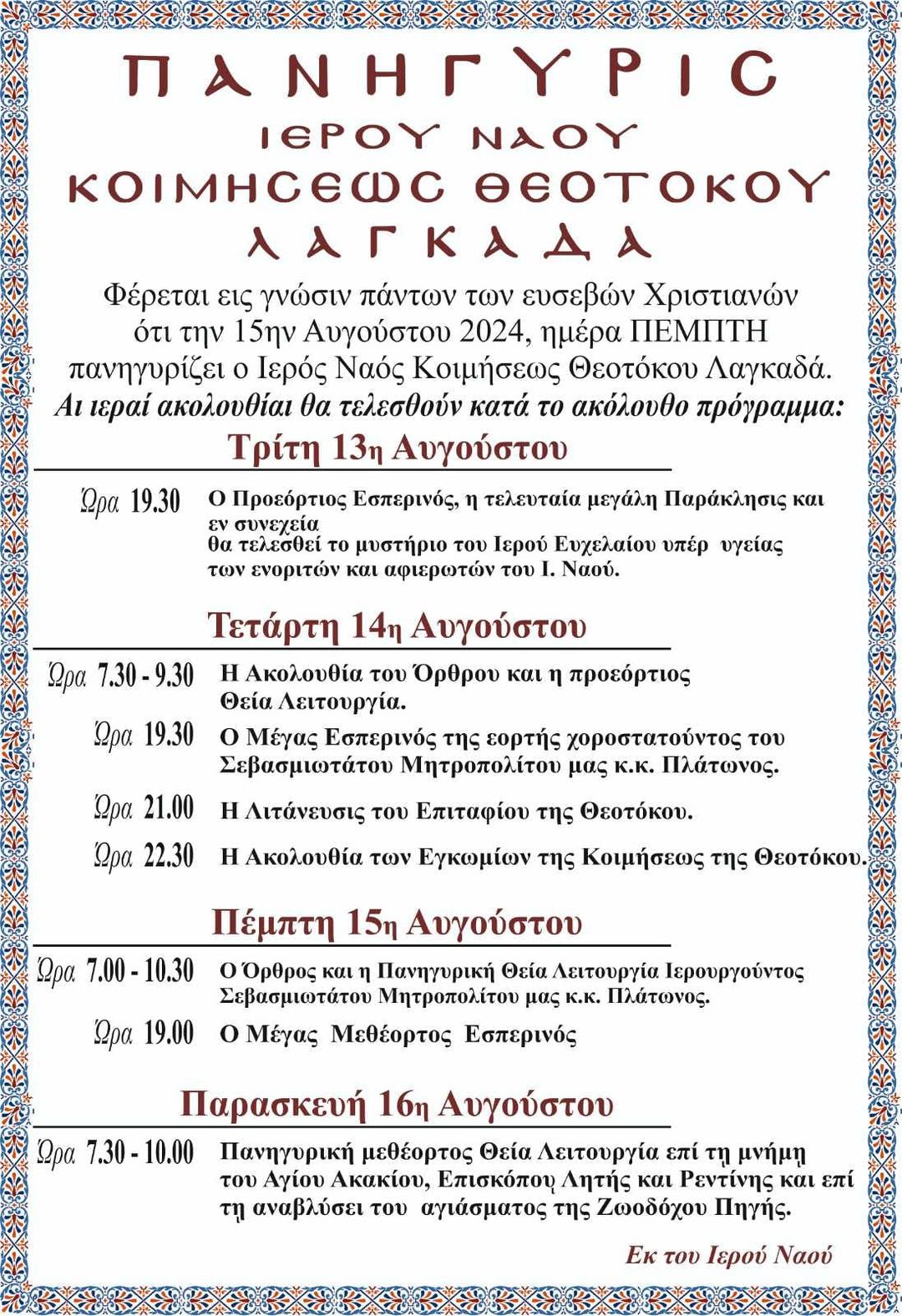 Πρόγραμμα Πανηγύρεως Ιερού Ναού Κοιμήσεως Θεοτόκου Λαγκαδά!!!!